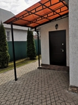 Односкатный небольшой навес-крыльцо с поликарбонатом примыкающий к дому на двух опорах